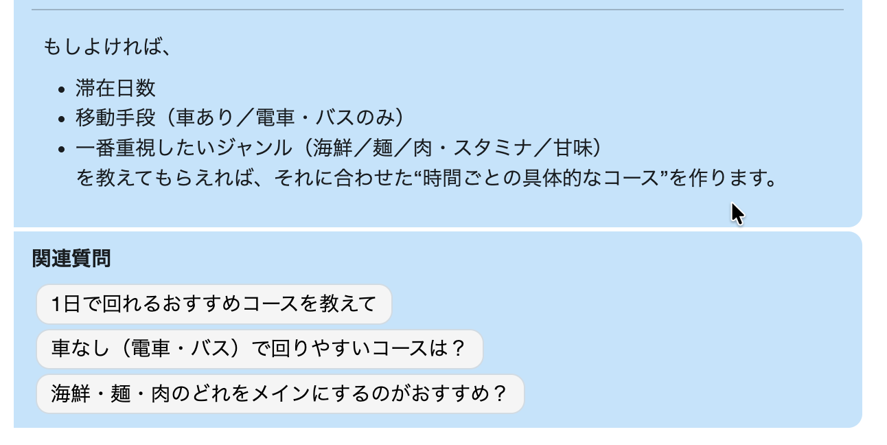 - 自動提案される関連質問の精度は、使用しているAIモデルに依存します。