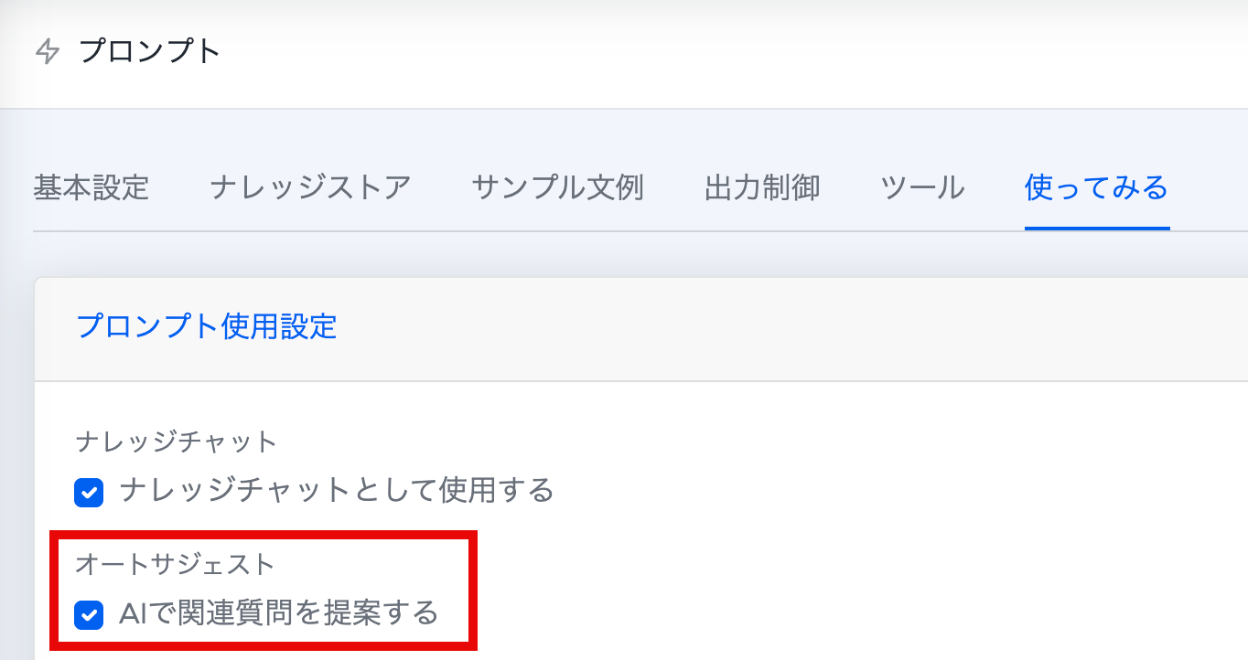 ナレッジチャットを有効にしたプロンプトを作成いただいた後、プロンプトの「使ってみる」タブで「AIで関連質問を提案する」をONにします。