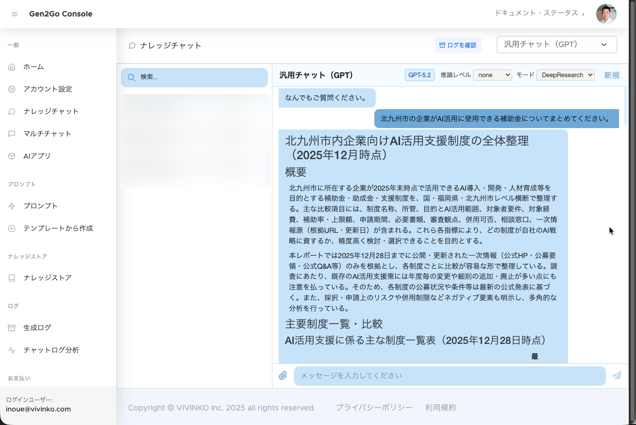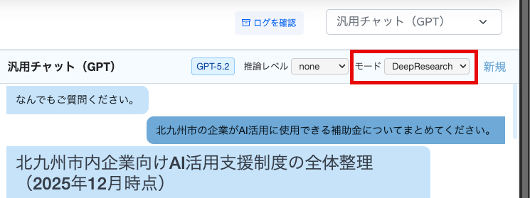 Deep Researchの使用時はナレッジチャット画面右上のモードで「DeepResearch」を選択します。
