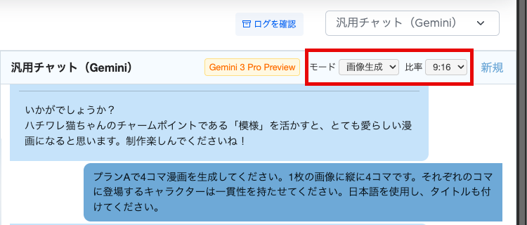 生成される画像の比率は、1:1(正方形)、16:9(横長)、9:16(縦長)から指定します。